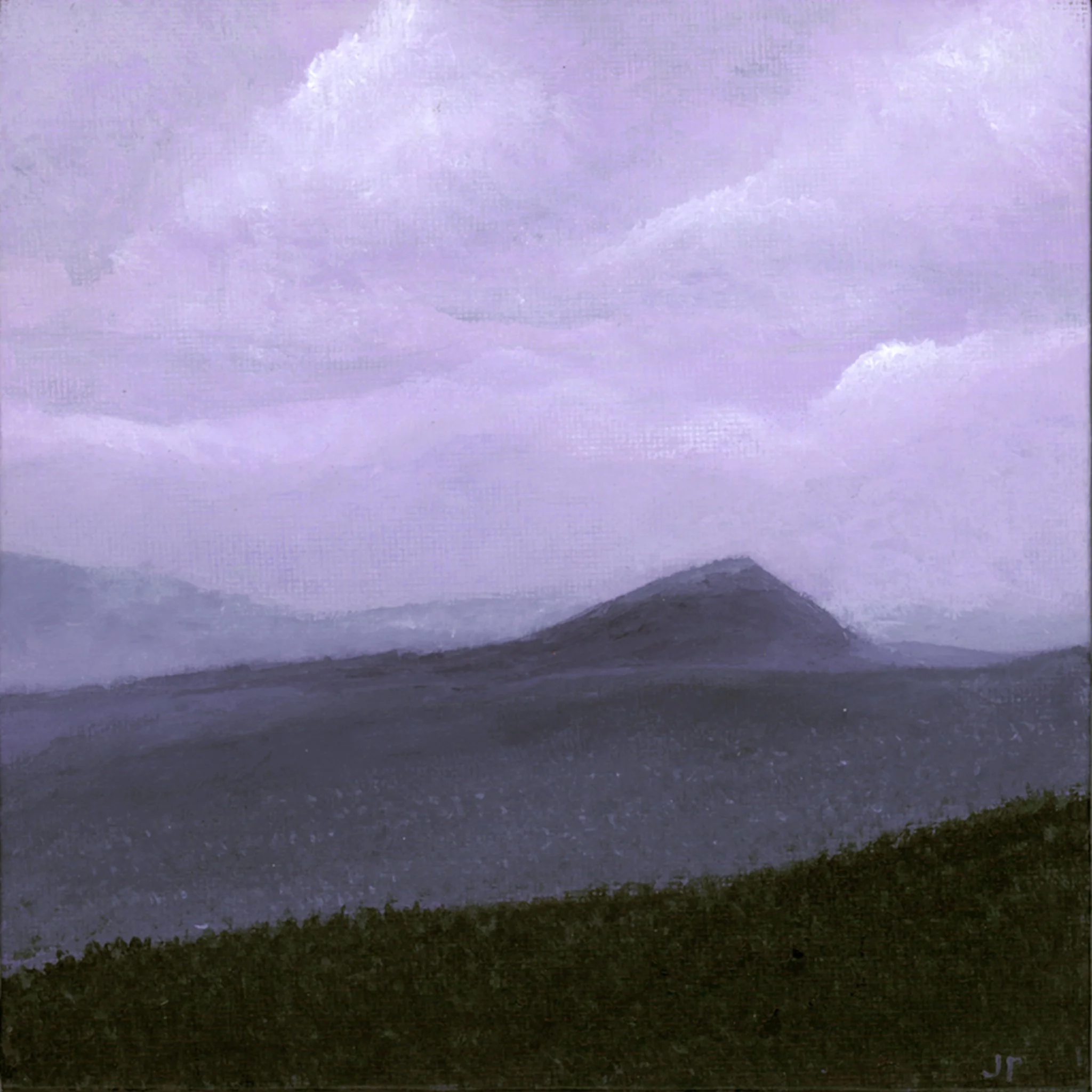 2x2" acrylic painting of purple mountains and clouds in Rangely, Maine. 09/2024. ©Jamie Peloquin 2024